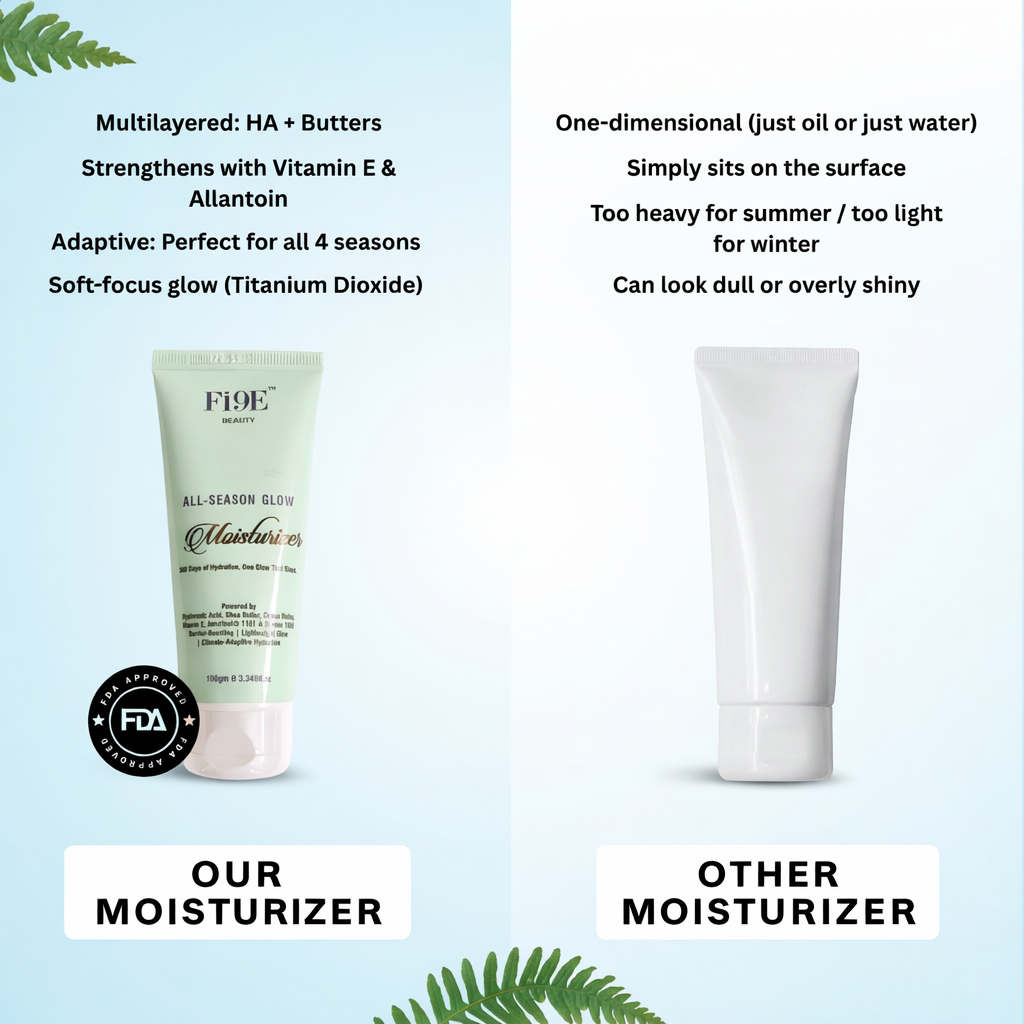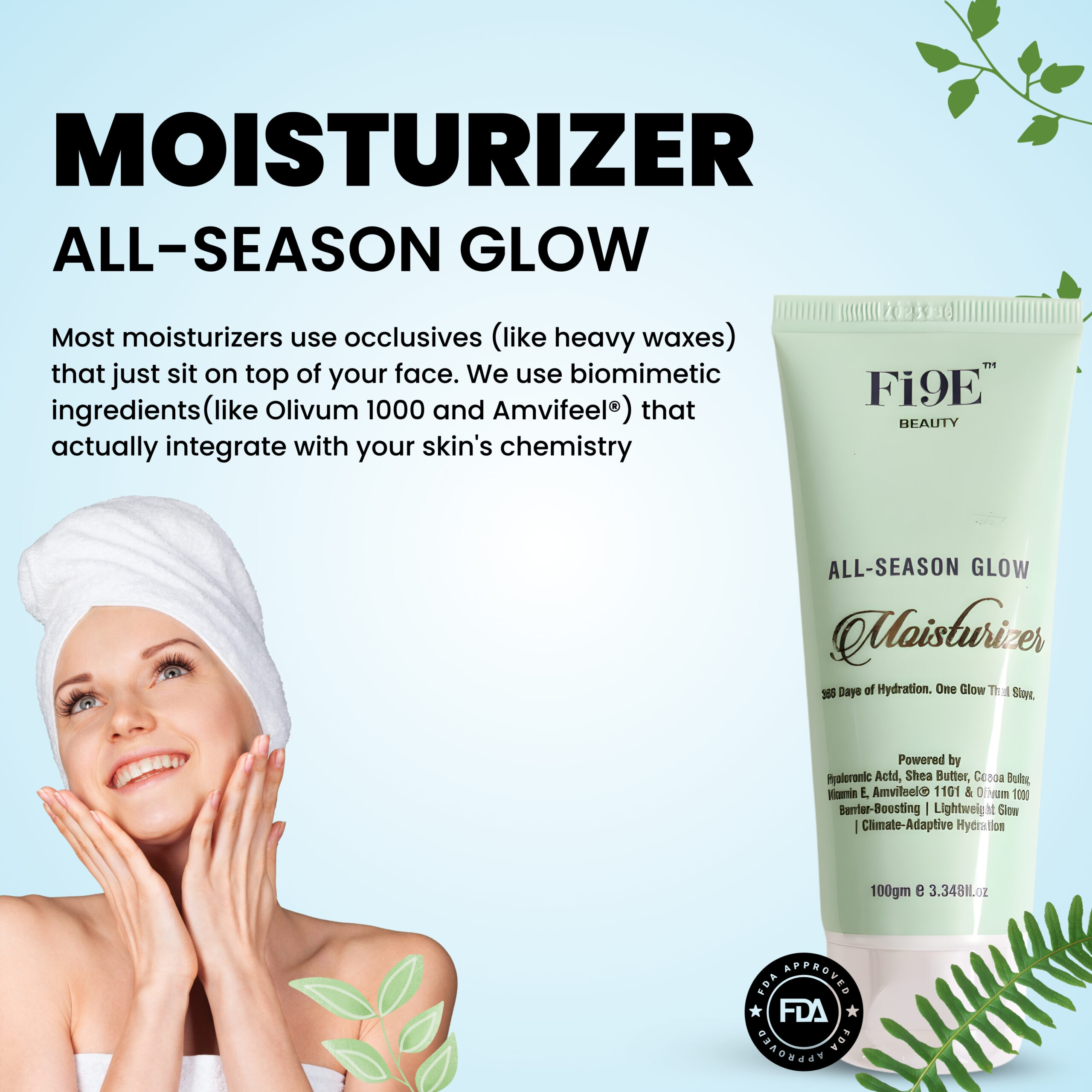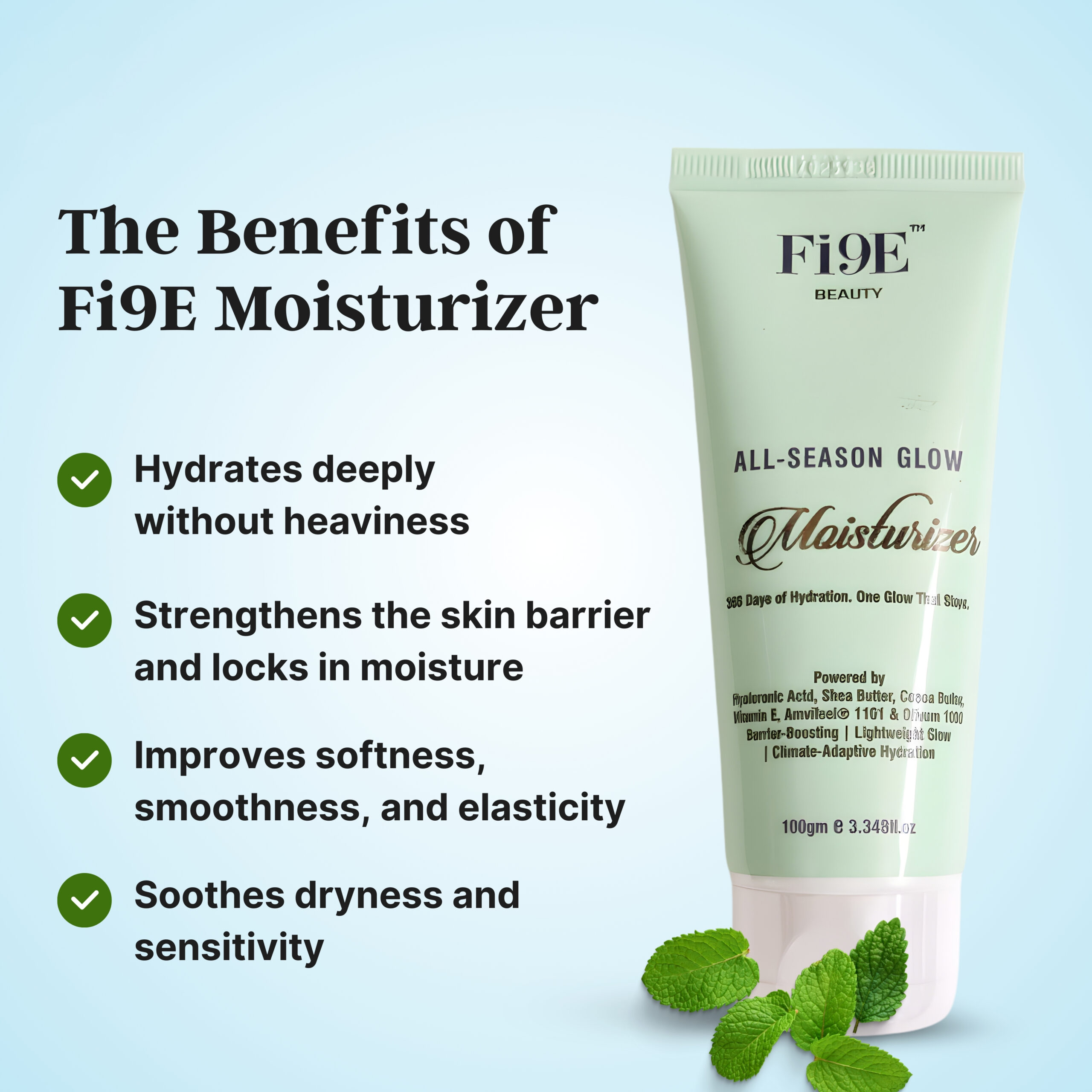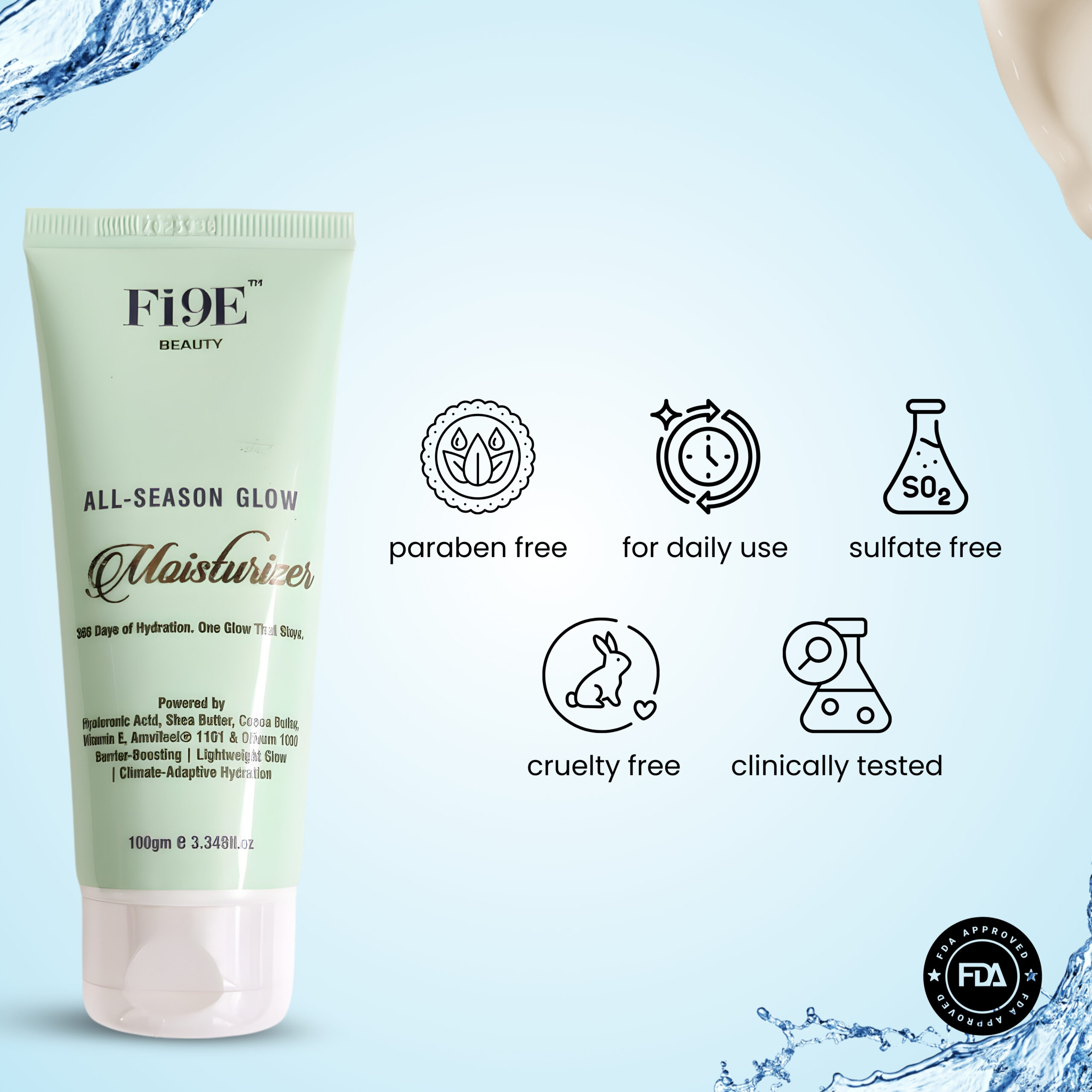FI9E Beauty All-Season Glow Moisturizer is a lightweight yet deeply nourishing daily hydrator, expertly formulated to deliver long-lasting hydration, strengthen the skin barrier, and enhance natural radiance across all seasons. Its fast-absorbing, non-greasy texture makes it ideal for everyday use on all skin types.