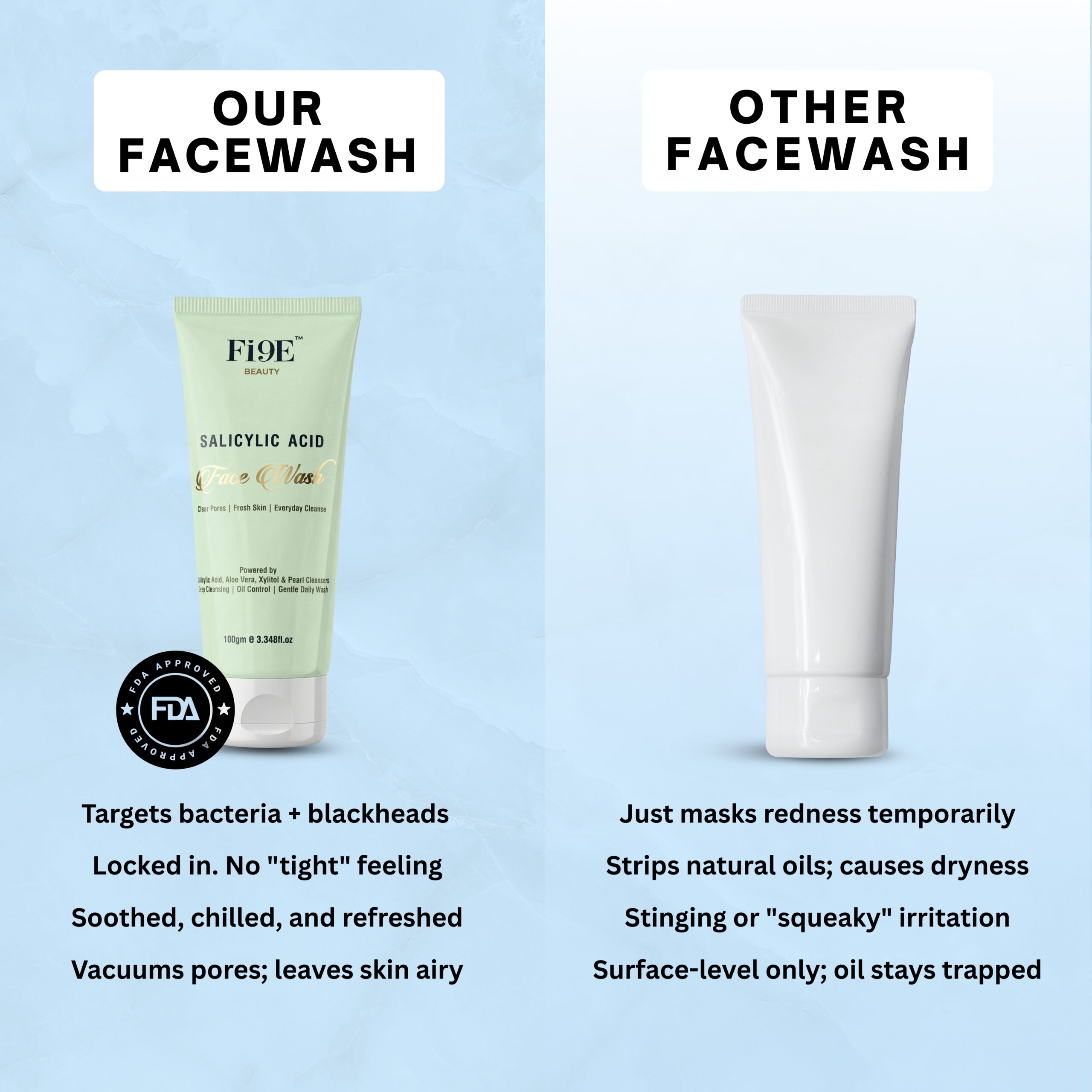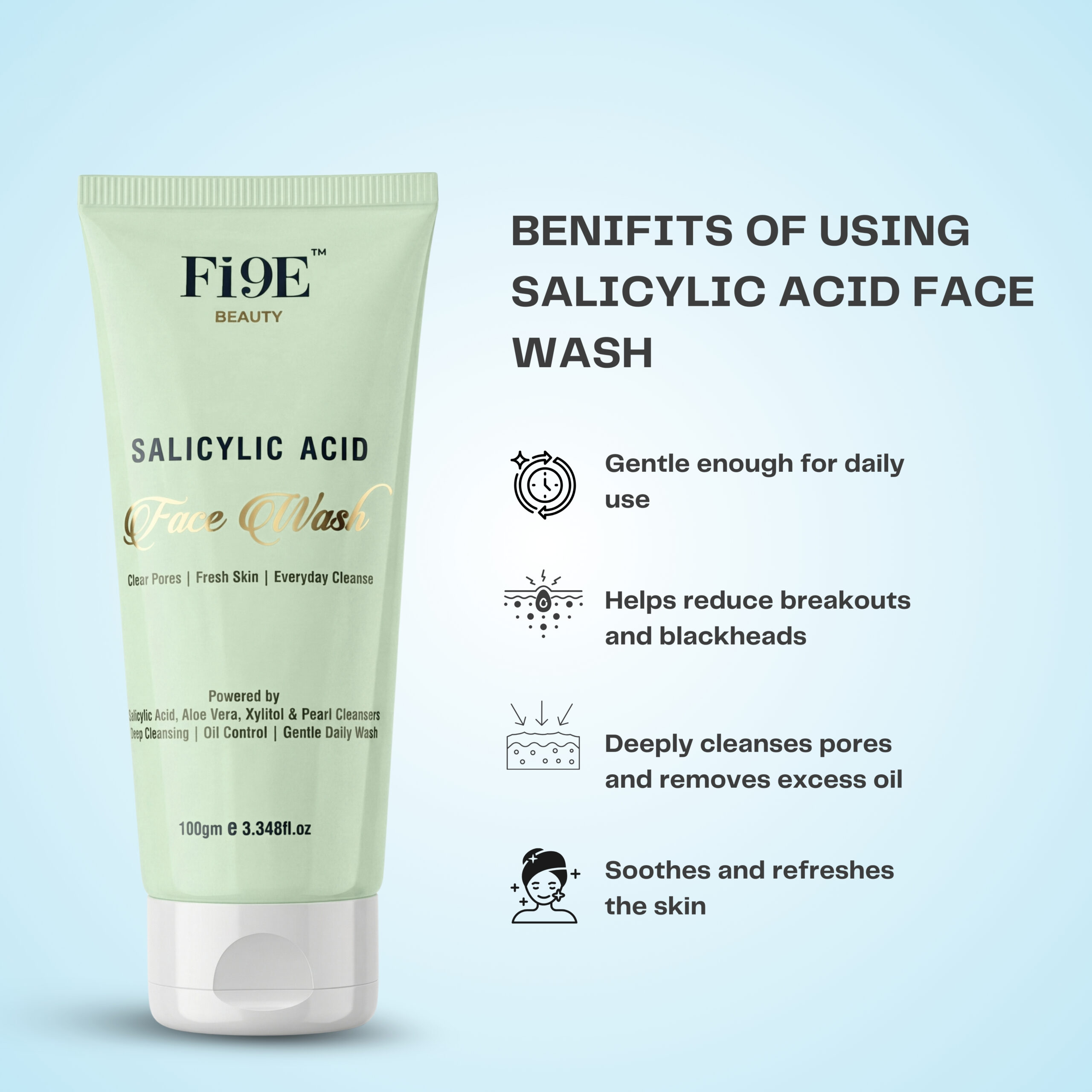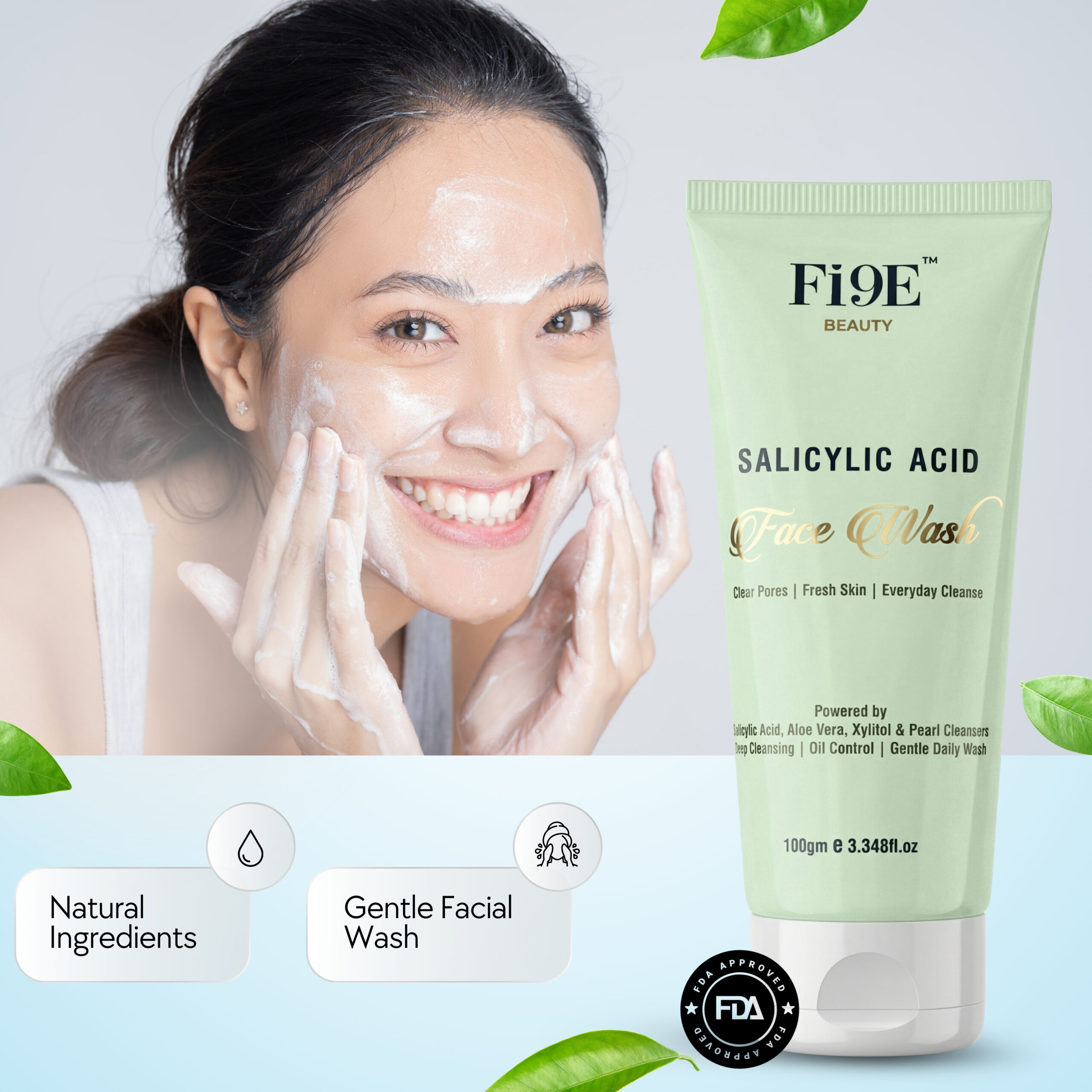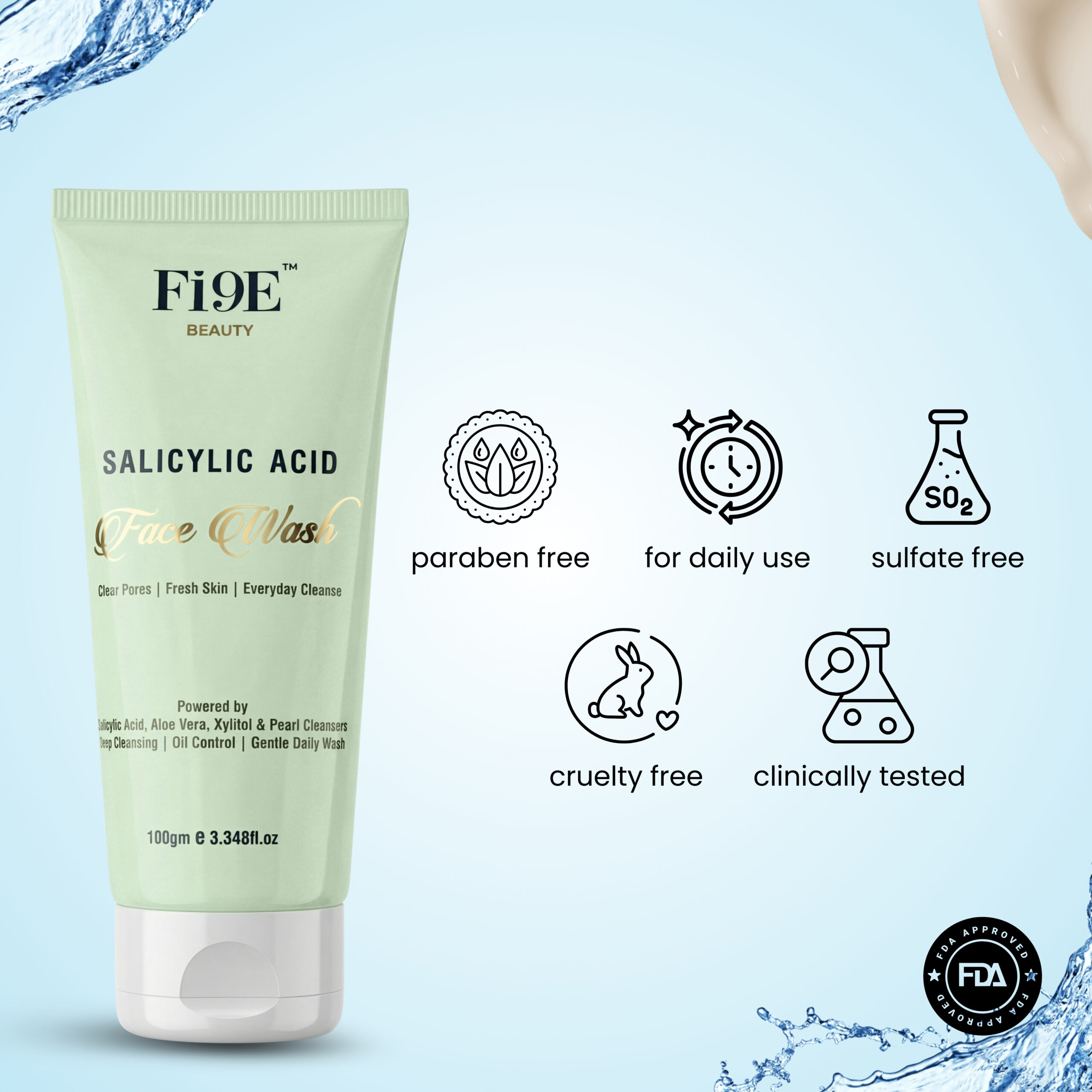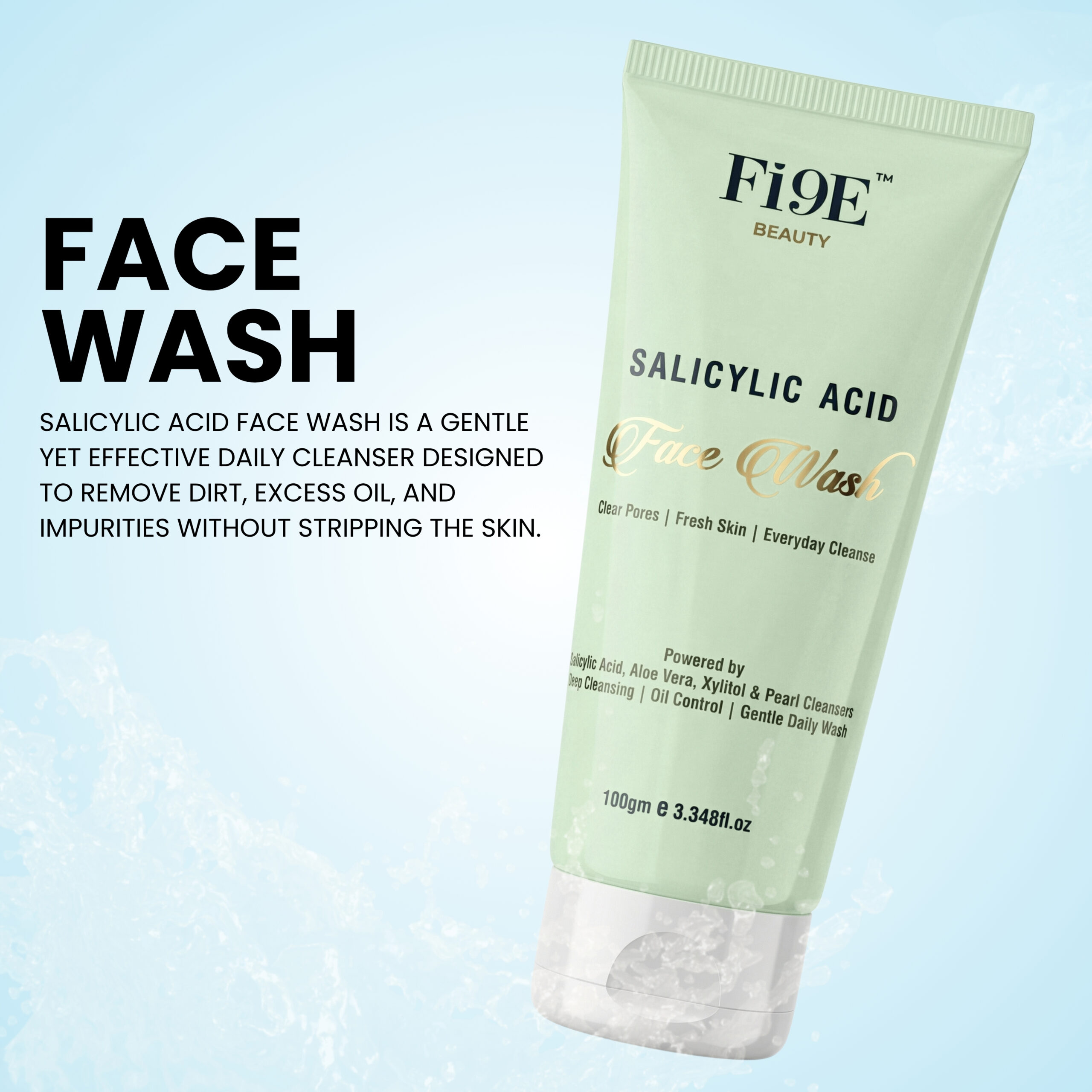 FI9E Beauty Salicylic Acid Face Wash is a gentle yet effective daily cleanser designed to remove dirt, excess oil, and impurities without stripping the skin. Enriched with exfoliating and hydrating actives, it helps keep pores clean, control oil, and maintain skin freshness with every wash.